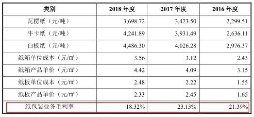 2018年大勝達負債總額上升較快,較上一年末增加了3.32億元,同比增長56.03%。 2016年至2018年,大勝達負債總額分別為5.90億元、5.93億元、9.26億元。公司稱,2018年末負債總額上升較快,主要因為2018年末公司短期借款較2017年末增加1.59億元,長期借款余額增加9631.00萬元,此外2018年由于收購永常織造導致遞延所得稅負債增加1581.30萬元,以上因素導致2018年末負債余額增加較多。 大勝達2018年毛利率下滑。2016年至2018年,大勝達紙包裝業務(產品含紙箱、紙板)各期的毛利率分別為21.39%、23.13%和18.32%,2017年較2016年上升,而2018年有所回調。