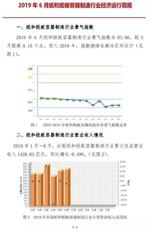 8月26日,中國(guó)包裝聯(lián)合會(huì)發(fā)布了2019年紙和紙板容器制造行業(yè)經(jīng)濟(jì)運(yùn)行簡(jiǎn)報(bào)。據(jù)顯示,今年1-6月,全國(guó)紙和紙板容器制造行業(yè)完成營(yíng)收1428.63億元,同比下降0.49%。其中: