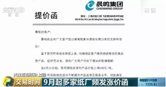 包裝紙方面,瓦楞紙價格從去年二季度5100元/噸上方,一路跌至今年二季度的3400元/噸左右,箱板紙也從5900元/噸附近跌至迫近4000元/噸;文化紙類雙膠紙價格從2018年二季度7500元/噸,到今年一季度跌至6000元/噸下方。 進入九月份,造紙業迎來行業旺季,全國多家紙廠此前已陸續發布漲價通知函。 央視走訪發現,這波漲價潮波及多個紙種,漲幅在50-200元/噸 上海中華印刷有限公司是國內規模最大的出版印刷企業之一,這里的采購供應部經理朱勇明告訴記者,公司每年會加工4-5萬噸的文化紙,其中超過一半的原材料都要從國內幾家大型造紙企業購買,前幾天公司已收到了來自上游造紙企業的漲價通知函。 上海中華印刷有限公司采購部經理 朱勇明:去年紙價漲到一定程度就降下來,今年年初的時候紙價非常低,平均大概在6000元/噸以下。今年到教材印制之前,開始陸續漲價了,這個月我們已經接到漲價通知函了。 8月13日,吉林省白山市琦祥紙業有限公司發布漲價函稱,將高強瓦楞紙90克、100克、110克、120克等品種在原有價格基礎上上調100元/噸,成為此輪紙價大范圍調漲的第一張漲價函。 隨后,華南、華北、華中地區的多家造紙廠陸續發布漲價通知,8月下旬,山東晨鳴、太陽紙業、金光紙業等行業龍頭公司也紛紛發出漲價通知。