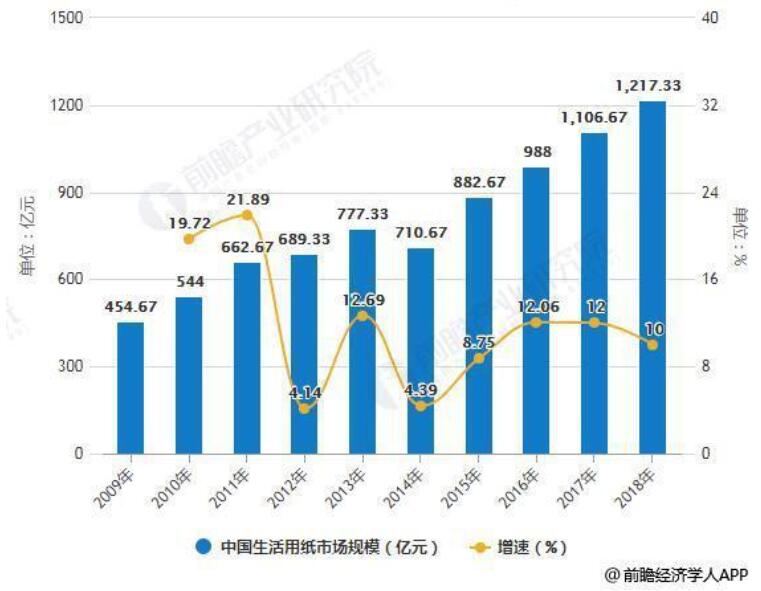 生活用紙增速最快產品結構也會逐漸調整 生活用紙因其剛需消費屬性,市場需求明顯優于其他紙種。在快速消費品中格局又顯著優于其他品類。成本端,漿價見頂利好生活用紙企業成本壓力釋放。目前在整個紙與紙制品中,生活用紙的增速最快,同時隨著消費升級,中國的生活用紙將持續增加,產品結構也會逐漸調整。 生活用紙成為造紙行業的主要增長極 行業規模上,我國2009年生活用紙市場規模為454.67億元,2017年市場規模擴大至1106.33億元,年復合增長率為11.8%。市場規模增速大于消費量增速同時暗示了單價的同步提升。同時,基于我國生活用紙人均用量與發達國家的差距及宏觀經濟發展對人均用量提升的助力,生活用紙市場擴容趨勢有望得以延續。’ 2009-2018年中國生活用紙市場規模統計及增長情況