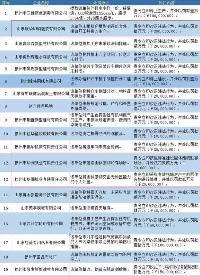 此外,還有一家印刷企業--山東聯華印刷包裝有限公司也被開了罰單。該企業因未報批環境影響評價文件,擅自開工并投入生產,被責令立即改正違法行為,并處以罰金30萬元。