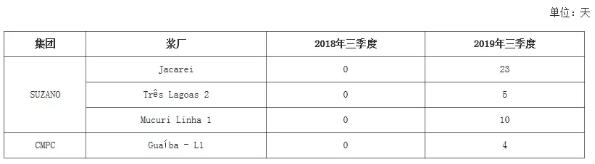 去產(chǎn)量 漿廠檢修時(shí)間增加 巴西統(tǒng)計(jì)部門公布數(shù)據(jù)顯示,2019年三季度巴西木漿產(chǎn)量501.90萬噸,環(huán)比下降1.53%,同比下降7.82%。產(chǎn)量同環(huán)比均下降,主要是受到Suzano公司主動(dòng)降產(chǎn)量,2019年5月5日Suzano發(fā)布公告計(jì)劃減產(chǎn)紙漿年產(chǎn)量100萬噸以上,從圖1也可以看出,發(fā)布公告后各月的產(chǎn)量均較去年同期出現(xiàn)下滑。表1所示的是漿廠的檢修時(shí)間,2018年三季度巴西主要漿廠沒有檢修情況,而今年三季度檢修時(shí)間達(dá)到42天,且主要集中在Suzano旗下的漿廠。經(jīng)過漿廠主動(dòng)降產(chǎn)量后,三季度Suzano紙漿產(chǎn)量209.5萬噸,同比下降24%,環(huán)比下降6%;CMPC紙漿產(chǎn)量106.6萬噸,同比下降1%,環(huán)比下降2%。 表1 巴西漿廠檢修情況