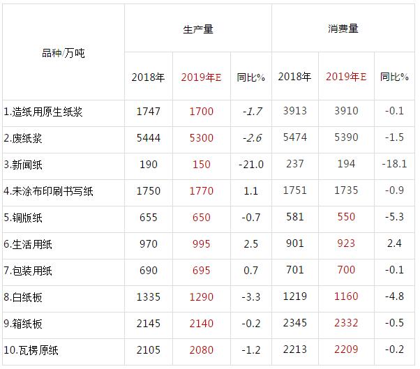 一、2019年1~9月生產完成情況 據國家統計局快報統計數據,截至2019年9月底,制漿造紙及紙制品業企業數量6641家,比去年同期減少31家。其中:紙漿制造業46家,增加3家,造紙業2498家,減少148家,紙制品制造業4097家,增加114家。 2019年1~9月國家統計局統計的生產量及對比去年同期數據情況: 紙及紙板9287萬噸,較去年同期累計產量增加421萬噸,增長4.7%; 紙漿968萬噸,較去年同期累計產量減少85萬噸,下降8.1%; 紙制品5217萬噸,較去年同期累計產量增加981萬噸,增長23%;其中:紙箱生產量2426萬噸,較去年同期累計產量增加305萬噸,增長14%。 二、主要經濟指標完成情況 據國家統計局統計數據,2019年1~9月規模以上制漿造紙及紙制品業企業主要經濟指標完成情況及對比去年的數據的情況如下。 1、主營業務收入 2019年1~9月全行業完成9775億元,比去年同期累計數據減少803億元,下降7.6%。其中: 紙漿制造業完成114億元,比去年同期數據減少9億元,下降8.0%; 造紙業完成5602億元,比去年同期數據減少249億元,下降11.8%; 紙制品制造業完成3583億元,比去年同期數據減少519億元,下降1.0%。 2、利潤總額 2019年1~9月全行業完成437億元,比去年同期累計數據減少154億元,下降26.0%。其中: 紙漿制造業虧損0.5億元,比去年同期累計數據增加11億元,下降105%; 造紙業完成217億元,比去年同期數據減少153億元,下降41.3%; 紙制品制造業完成220億元,比去年同期數據增加11億元,增長5.2%。 3、產成品存貨 2019年1~9月全行業533億元,比去年同期數據減少55億元,下降9.4%。其中: 紙漿制造業10億元,比去年同期數據增加3.6億元,增長58.2%; 造紙業347億元,比去年同期數據減少66億元,下降16.1%; 紙制品制造業176億元,比去年同期數據增加8億元,增長4.5%。 4、應收賬款凈額 2019年1~9月全行業2258億元,比去年同期累計增長31.7%。其中: 紙漿業:32億元,比去年同期累計增長155.7%; 造紙業:1360億元,比去年同期累計增長36.7%; 紙制品業:866億元,比去年同期累計增長22.3%。 5、虧損企業數 2019年1~9月全行業1300個,比去年同期累計增加13.7%。其中: 紙漿業:17個,比去年同期累計增長70.0%; 造紙業:596個,比去年同期累計增長5.6%; 紙制品業:687個,比去年同期累計增長2.9%。 綜合2019年和2018年的統計快報數據分析,2019年前9個月全行業整體運行和經濟指標完成情況不如上年。 三、商品紙漿和廢紙原料進出口 1、 商品紙漿進出口情況分析 2019年1~9月進口各類商品紙漿1981萬噸,增加114萬噸,同比增長6.1%。 其中: 漂針漿653萬噸,同比增加37.4萬噸,增長6.1%; 漂闊漿858萬噸,同比增加15萬噸,增長1.7%; 本色漿57萬噸,同比減少3萬噸,下降5%; 溶解漿233萬噸,同比增加28萬噸,增長13.7%; 廢紙漿57萬噸,同比增加26萬噸,增長1.4倍。 從前9個月的商品紙漿進口數據上看,除本色木漿有減少外,其他品種都有所增加,但增長最多的是廢紙漿。 根據2019年前9個月的進口量及商品紙漿市場供應情況并結合國內紙漿、紙及紙板生產情況看,我們預計2019年全年商品紙漿進口總量約為2700萬噸(含溶解漿310萬噸,廢紙漿90萬噸),造紙用進口商品紙漿實際用量同比增長約4.8%。 出口量預計10萬噸,與上年基本持平。 2、廢紙進口及廢紙漿生產情況 2019年1~9月累計進口各類廢紙812萬噸,比上年同期減少341萬噸,下降30%。 其中: OCC:617萬噸,同比減少235萬噸,下降27.6%; ONP/OMG:168萬噸,同比減少83萬噸,下降33.1%; MOW:27萬噸,同比減少22萬噸,下降44.9%。 2018年國內生產廢紙漿5444萬噸,廢紙總用量約6667萬噸。其中:進口廢紙1703萬噸,國內回收各類廢紙約4964萬噸。 2019年在環保許可和進口質量標準約束下,廢紙進口量還要繼續減少,我們預計2019年全年進口廢紙約1000萬噸左右,比去年下降約40%。由于受可回收總量的制約,國內廢紙回收量將比上年有下降,但生產企業對采購質量要求都有提高,會彌補部分總量。預計全年國內回收廢紙4900萬噸,比去年減少約60萬噸。生產廢紙漿合計約5300萬噸,比上年下降約2.6%。 3、原生紙漿生產與消費預判 根據上述對國內原生紙漿生產和商品紙漿、廢紙進口情況,結合國內紙及紙板生產和消費及國內廢紙回收情況分析,我們預計2019年國內原生紙漿全年生產量約為1700萬噸,比去年下降約1.7%,加上進出口量,預計全年造紙用原生紙漿表觀消費量約3910萬噸,同比下降約0.1%。 四、2019年紙及紙板主要品種生產消費分析與預判 根據紙漿造紙行業2019年前9個月的生產、銷售和進出口數據,以及對今年后續生產、市場需求及進出口情況的調研,我們預計全年紙漿、廢紙和紙及紙板進出口、生產與消費情況如下: 。ㄒ唬2019年主要產品進出口量預測