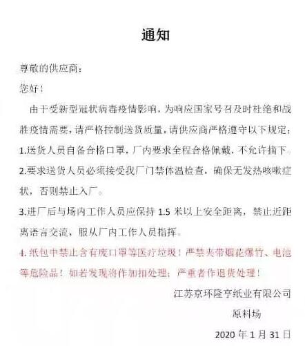 【江蘇富星紙業】各供應商:江蘇富星紙業于2月3日開始收貨的通知改成2020年2月9日起開始正常收貨,望大家相互轉告!謝謝!