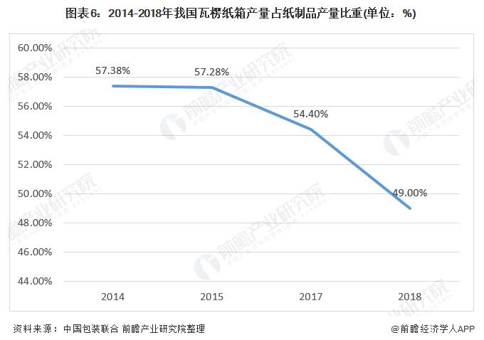 與世界主要國家相比,我國瓦楞紙箱行業(yè)雖然起步較晚,但增長十分迅速。早在2003年,我國便已超過日本成為全球第二大瓦楞紙箱生產(chǎn)國,僅次于美國。根據(jù)中國包裝聯(lián)合會統(tǒng)計,2018年,我國瓦楞紙箱產(chǎn)量為2733.46萬噸,占當(dāng)年紙制品產(chǎn)量的49.00%。