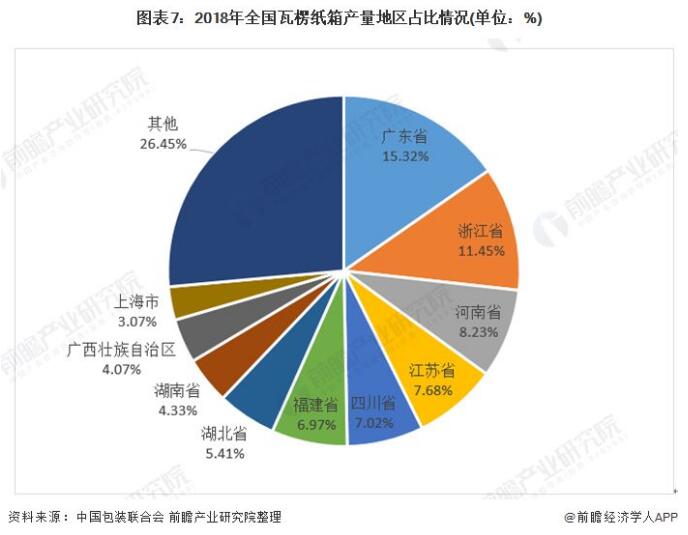 瓦楞包裝集中在珠三角、長三角、環(huán)渤海三大地區(qū) 受限于瓦楞紙箱產(chǎn)品的銷售半徑,瓦楞紙箱生產(chǎn)企業(yè)主要分布在下游消費(fèi)品制造業(yè)生產(chǎn)基地附近,珠三角、長三角、環(huán)渤海三大地區(qū)占了近70%的份額。近年來,隨著中央西部大開發(fā)、中部崛起等區(qū)域經(jīng)濟(jì)政策的實(shí)施,中西部制造業(yè)工業(yè)體系逐步完善,帶動包括瓦楞紙箱在內(nèi)的紙包裝行業(yè)新建產(chǎn)能向中西部轉(zhuǎn)移,行業(yè)的地域布局漸趨合理。近年來,行業(yè)龍頭企業(yè)合興包裝、界龍實(shí)業(yè)等紛紛在中部湖北漢川、西南成都地區(qū)投資設(shè)廠。 根據(jù)中國包裝聯(lián)合會數(shù)據(jù)統(tǒng)計,2018年,全國瓦楞紙箱行業(yè)完成產(chǎn)量2733.46萬噸,同比下降3.99%。產(chǎn)量排在前五位的地區(qū)是廣東省、浙江省、河南省、江蘇省、四川省。其中廣東省完成累計產(chǎn)量418.76萬噸,占比15.32%,同比增長9.54%;浙江省完成累計產(chǎn)量312.89萬噸,占比11.45%,同比下降20.87%;河南省完成累計產(chǎn)量224.89萬噸,占比8.23%,同比增長8.87%;江蘇省完成累計產(chǎn)量210萬噸,占比7.68%,同比下降8.71%;四川省完成累計產(chǎn)量191.82萬噸,占比7.02%,同比下降5.29%。
