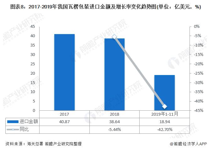 瓦楞包裝行業(yè)進(jìn)口稅率下降 有望繼續(xù)拉動進(jìn)口增長 2017-2019年,我國瓦楞包裝行業(yè)產(chǎn)品進(jìn)口金額呈逐年下降趨勢,降幅加速。2017年,我國瓦楞包裝進(jìn)口金額為40.87億美元;2018年,我國瓦楞包裝進(jìn)口金額為38.64億美元,同比下降5.44%;2019年1-11月,我國瓦楞包裝進(jìn)口金額為18.94億美元,同比下降42.70%。