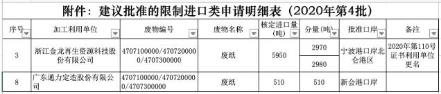 2020年3月7日,固廢中心公布的2020年第4批限制進(jìn)口類(lèi)申請(qǐng)明細(xì)表顯示,審核通過(guò)廣東通力定造股份有限公司廢紙核定進(jìn)口總量為0.0510萬(wàn)噸。其中浙江金龍?jiān)偕Y源科技股份有限公司為2020年第110號(hào)證書(shū)利用單位更名。