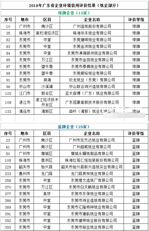 2020年3月12日,廣東省生態環境廳對2018年廣東省企業環境信用評價結果進行了公示,公示期為2020年3月12日至3月26日。公示名單中,獲得2018年廣東省企業環境信用評價“綠牌企業”的紙企共13家,“藍牌企業”共29家,“黃牌企業”共3家,沒有紙企被評為“紅牌企業”。