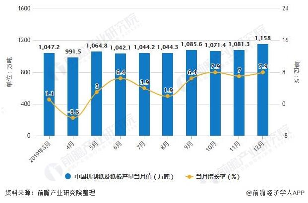 2019年1-12月中國機制紙及紙板產量當月值統計及增長情況