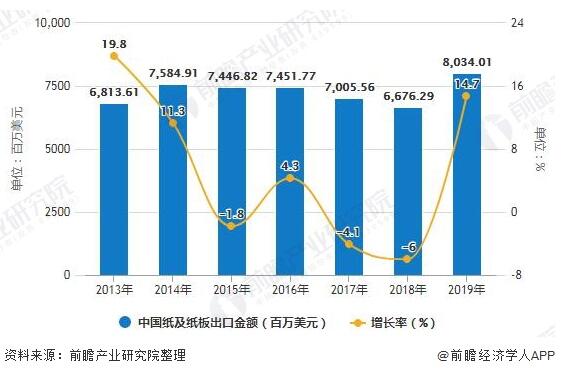 2013-2019年中國紙及紙板出口金額統計及增長情況
