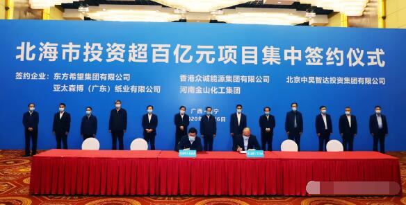 4月26日,廣西北海市投資超百億元項目集中簽約儀式在南寧成功舉行,亞太森博(廣東)紙業有限公司投資的林漿紙一體化項目等5個投資超百億元項目在簽約儀式上成功簽約。