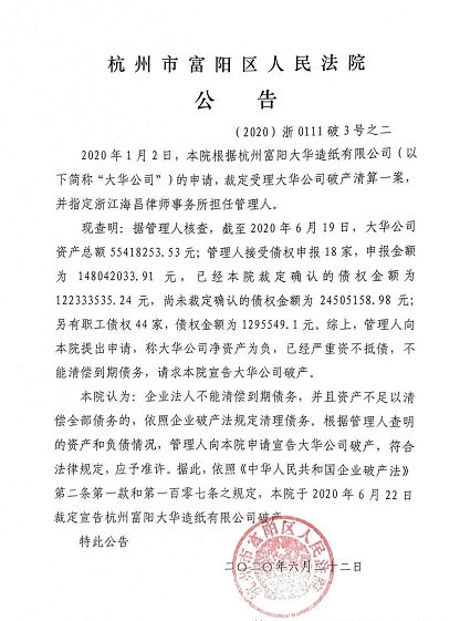 6月22日,杭州市富陽(yáng)區(qū)人民法院公告杭州富陽(yáng)大華造紙有限公司正式破產(chǎn)。杭州富陽(yáng)大華造紙有限公司于2002年11月29日在杭州市富陽(yáng)區(qū)市場(chǎng)監(jiān)督管理局登記成立,地址位于杭州富陽(yáng)區(qū)靈橋鎮(zhèn)濱江路8號(hào),法定代表人張文勝,公司經(jīng)營(yíng)范圍包括生活用紙制造,銷(xiāo)售;貨物進(jìn)出口(法律、行政法規(guī)禁止經(jīng)營(yíng)的項(xiàng)目除外,法律、行政法規(guī)限制經(jīng)營(yíng)的項(xiàng)目取得許可證后方可經(jīng)營(yíng))等。