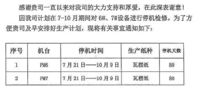 一邊宣布漲價,一邊計劃停機,龍頭紙廠的操作總是那么“強勢”。7月3日,東莞玖龍發(fā)布停機公函稱,計劃在7月21日-10月9日期間,對PM6、PM7兩條瓦楞紙生產(chǎn)線進行停機檢修,時長均為80天。