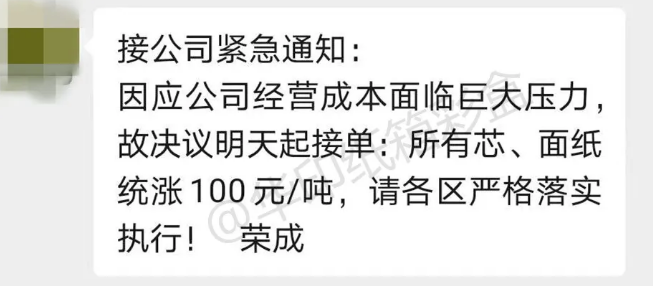 另一紙業(yè)巨頭榮成也宣布21日起漲價