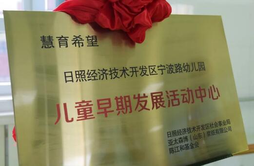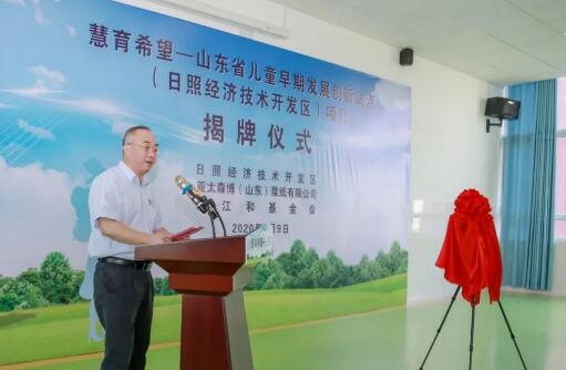 揭牌儀式由日照經(jīng)濟技術(shù)開發(fā)區(qū)管委副主任楊士峰主持。亞太森博(山東)漿紙有限公司董事總經(jīng)理陳小榮現(xiàn)場致辭,他說,我們一直高度重視教育并積極參與公益事業(yè)。公司投入1300萬元、連續(xù)10年實施“圓夢行動”項目,助力貧困學(xué)子圓夢大學(xué)、解決就業(yè);連續(xù)15年在中小學(xué)中實施“利民興教”項目,通過支持學(xué)校開展教師培訓(xùn)、獎學(xué)獎教、文化體育等活動,幫助學(xué)校全面提升教育教學(xué)水平;截至目前,公司的教育扶持系列項目直接受益師生超過15萬人次。我們在小學(xué)中開展了“我是小小造紙家”活動,6000多人次直接受益。現(xiàn)在,公司在陳江和基金會的指導(dǎo)下,在開發(fā)區(qū)實施“慧育希望”項目,促進0-3歲幼兒發(fā)展。至此,公司在日照市教育的各個階段中都留下了公益身影。今天,我們欣喜的看到慧育希望項目在日照開發(fā)區(qū)開花結(jié)果。接下來,我們計劃在日照市建設(shè)更多兒童早期發(fā)展活動中心,讓更多的幼兒和他們的家庭受益。
