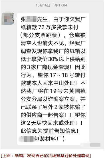 紙箱廠成功結(jié)清第一批6月份貨款,但7月、8月貨款卻收到兩張空頭支票,無(wú)法取現(xiàn),加上9月份未結(jié)清貨款已達(dá)77萬(wàn)余元。一再追問(wèn)下,張某以資金周轉(zhuǎn)困難為由搪塞。  追討無(wú)果,紙箱廠老板報(bào)警。小欖警方迅速梳理、偵查,并成功鎖定犯罪嫌疑人。10月21日,在貴州警方的協(xié)助下成功抓獲犯罪嫌疑人張某和姚某。 經(jīng)審訊,犯罪嫌疑人張某、姚某以開公司為幌子,由張某負(fù)責(zé)“采購(gòu)”,姚某負(fù)責(zé)“銷售”,短時(shí)間內(nèi)“采購(gòu)”大量紙箱,并低于市場(chǎng)價(jià)迅速轉(zhuǎn)手套現(xiàn),非法所得大多用于賭博。偵查發(fā)現(xiàn),同時(shí)被騙的還有其他幾個(gè)紙箱廠。