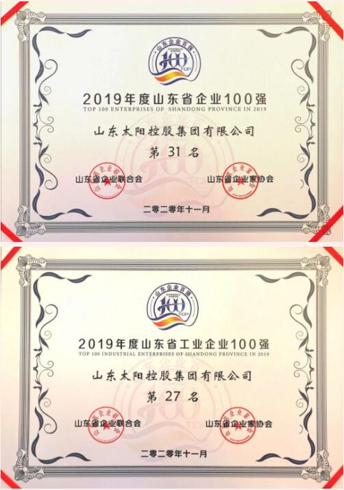 11月11日,山東省百強企業(yè)發(fā)布會在泉城濟南隆重舉行,會上發(fā)布了2019年度山東省綜合百強和工業(yè)百強企業(yè)榜單,山東太陽控股集團有限公司(以下簡稱“太陽控股集團”)再次榮登榜單,分別位列山東省綜合百強企業(yè)第31位、山東省工業(yè)百強企業(yè)第27位。