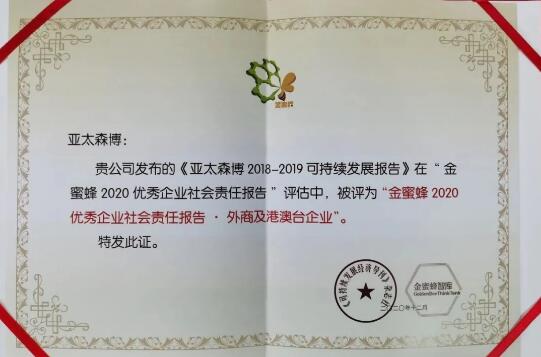 “金蜜蜂中國企業社會責任報告榜”是中國最具權威性的社會責任報告評估榜單之一,已經連續發布13年,累計評估報告1.5萬余份,近250家企業的700余份報告上榜,成為全面展示優秀企業社會責任報告及企業的專業平臺。本次主辦方對《亞太森博2018-2019可持續發展報告》作了如下評價:報告圍繞“開發永續資源,創造美好生活”的宗旨,披露亞太森博貫徹“保護環境,為客戶創造價值,實現利民、利國、利業”可持續發展理念的生動實踐,系統呈現了公司為利益相關方創造價值、促進經濟發展、環境保護、促進社會包容性發展等方面的舉措和成效,是外資企業社會責任報告的典范。