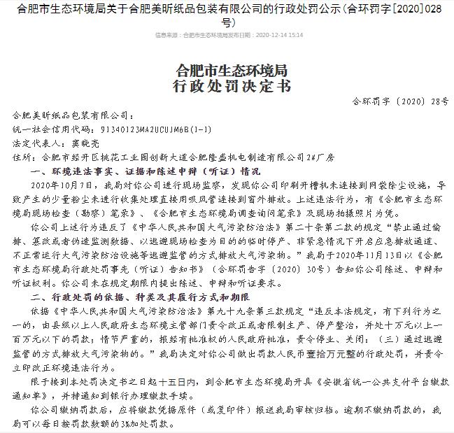 導(dǎo)語:12月14日,安徽省合肥市生態(tài)環(huán)境局發(fā)布一則關(guān)于合肥美昕紙品包裝有限公司的行政處罰公示:2020年10月7日,我局對你公司進(jìn)行現(xiàn)場監(jiān)察,發(fā)現(xiàn)你公司印刷開槽機(jī)未連接到網(wǎng)袋除塵設(shè)施,導(dǎo)致產(chǎn)生的少量粉塵未進(jìn)行收集處理直接用吸風(fēng)管連接到窗外排放。