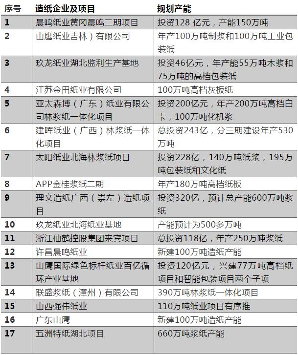 不過,與2020相比,2018年的造紙大躍進簡直是小巫見大巫。由于禁限塑風潮在全國刮起,根據(jù)華創(chuàng)證券的估算,箱板紙2025年面臨的來自快遞領域的替代需求為491萬噸。預計2025 年白卡紙?zhí)娲惋嬐赓u領域一次性塑料餐具規(guī)模有望達到234萬噸,替代商超藥店等零售領域不可降解塑料袋規(guī)模有望達到117萬噸,2025年白卡紙總替代需求將高達350萬噸。如果不考慮塑料行業(yè)新增的可降解塑料產(chǎn)能,則未來五年包裝紙需求將增加841萬噸。 但是,中國的造紙行業(yè)產(chǎn)能擴張的速度實在是太快了,2020年,不但新增包裝紙產(chǎn)能就高達730萬噸,基本上已經(jīng)覆蓋了塑料包裝完全滅絕的理想狀況下新增的造紙需求,而且規(guī)劃中的產(chǎn)能竟然高達4600萬噸。可謂登峰造極,無以復加。 2020年,即便放在全人類歷史上,也是造紙產(chǎn)能大躍進的一年。 表三,2020年新投產(chǎn)造紙項目一覽表