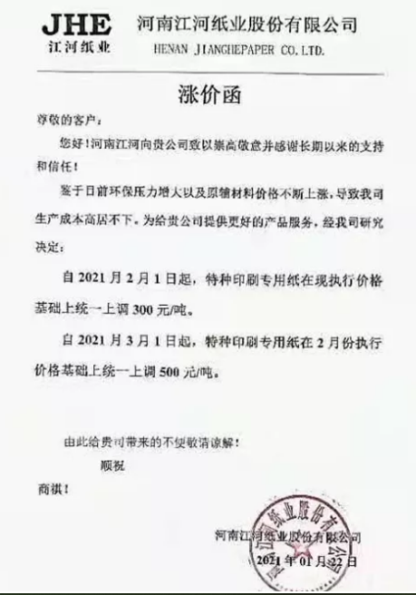 5、河南江河紙業(yè) 鑒于日前環(huán)保壓力增大以及原輔材料價格不斷上漲,導致我司生產成本高居不下。為給貴公司提供更好的產品服務,經我司研究決定: 自2021年2月1日起,特種印刷專用紙在現執(zhí)行價格基礎上統(tǒng)一上調300元/噸。 自2021年3月1日起,特種印刷專用紙在2月份執(zhí)行價格基礎上統(tǒng)一上調500元/噸。
