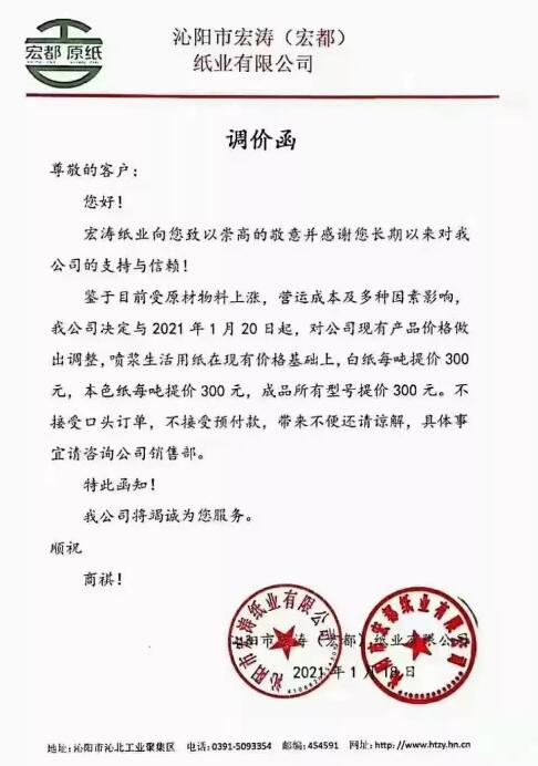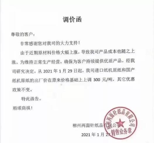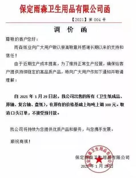 2020年12月以來,紙漿價格一路高漲,極大地增加了生活用紙市場的熱度,春節(jié)和疫情對生活用紙的影響非常大,生產(chǎn)企業(yè)們庫存消耗減少,紛紛依據(jù)行情做出漲價調整,漲價函頻頻發(fā)出,近期,又有多家企業(yè)發(fā)出漲價通知。 多家企業(yè)繼續(xù)發(fā)布漲價函 廣東信達紙業(yè):自2021年1月27日起,我司原紙每噸提價300元。 河北金博士衛(wèi)生用品:自2021年1月28日起,白色復卷用軸(含高濕強)上調300元/噸;面巾用軸上調300元/噸;本色復卷用軸上調300元/噸,本色面巾用軸上調300元/噸。 泰盛(江西)生活用品:1、自2021年2月18日起,在2月1日的價格政策基礎上上調漲400元/噸。2、自2021年3月1日起,在2月18日的價格政策基礎上上調漲300元/噸。 晨鳴集團:自2021年1月31日起,我司生活用紙原紙每噸提價200元/噸;自2021年2月18日起,我司生活用紙原紙每噸提價300元/噸; 維爾美紙業(yè)(重慶)有限公司:自2021年2月18日起,在2月1日的價格政策基礎上調400元/噸;自2021年3月1日起,在2月18日的價格政策基礎上調400元/噸;