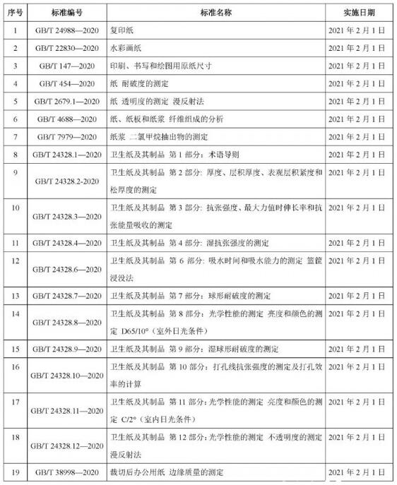 2020年發布的GB/T 24988—2020《復印紙》等19項造紙國家標準已于2021年2月1日實施,請各相關單位積極執行新標準。