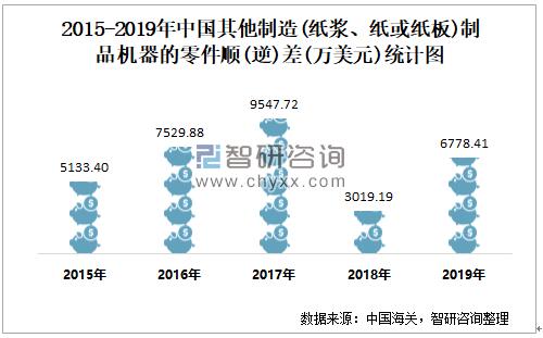 2015-2019年中國其他制造(紙漿、紙或紙板)制品機器的零件順(逆)差統計圖