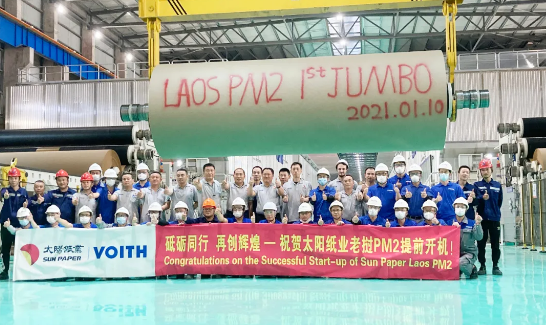 授予老撾PM2最快開機紀錄證書 ●老撾PM1:高檔包裝紙,80萬噸/年 ●老撾PM2:1小時46分鐘包裝紙機最快開機紀錄、36天最快開機調試紀錄、以及最快一等品(第三個母卷)紀錄 ●兗州PM39:16個月最快項目執行紀錄,特色文化紙,45萬噸/年 ●兗州PM40:20英寸揚克缸,MG特種紙 太陽老撾兩臺福伊特紙機項目簽署于2018年,是太陽紙業的首個海外紙機項目,也是福伊特造紙中國作為整線供應商提供的首個海外包裝紙機項目。 老撾項目是雙方團隊精誠合作、共克時艱的典范!在受疫情嚴重影響的老撾,兩個團隊擰成一股繩,克服重重困難,盡心盡力推動項目進程,成功實現兩臺紙機提前開機! 應廣東 太陽紙業副總經理兼總工程師  授予老撾PM2最短調試記錄獎杯 老撾PM1&2的提前投產標志著福伊特為太陽紙業提供的6臺包裝紙機已全部投產,進一步推動了太陽紙業實現“林漿紙一體化”的戰略里程碑。兩臺紙機能夠在保持高車速、高效率的前提下,保證產品品質,生產的高檔牛皮箱板紙具有運行效率高、成形好、橫幅定量均一、成紙強度高、質量成熟穩定等特點。 張愛民 太陽紙業沙灣有限公司生產總監  授予老撾PM2最快一等品記錄獎杯 兗州PM39特色文化紙項目再次展示了“太陽速度”。雙方團隊不畏疫情迎難而上,從工廠土建到紙機開機用時不到15個月,半年內即完成主體設備安裝,設備調試僅用時七周,創造了最快項目執行紀錄。 39號機是太陽最大幅寬、最高車速的紙機,其生產的產品最具競爭力和差異化,具有平滑度高、紙面細膩、色澤柔和等特性。該項目的順利投產鞏固了太陽紙業在高端文化紙領域的競爭力! 吳文春 太陽紙業文化紙事業線總監