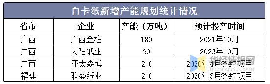白卡紙(原生白板紙)原材料為木漿,白板紙(再生白板紙)原材料為廢紙。白卡較白板紙更光滑,價格更高,更多用作高檔包裝,但在一定程度上二者可相互替代。 白卡紙是一種較厚實堅挺純優質木漿制成的白色卡紙,經壓光或壓紋處理,主要用于包裝裝潢用的印刷承印物。 一、白板紙分類情況  資料來源:華經產業研究院整理 二、我國白卡紙行業發展現狀 2020年以來受疫情影響,紙品需求受到一定抑制和負面沖擊。2020年4月下旬開始,行業木漿系紙品出現大幅下滑,但6月開始,行業價格開始逐步企穩回升,伴隨需求回暖,白板紙去庫存速度較好至合理水平后,白板紙市場將會逐漸復蘇。 2012-2019年我國白板紙產能總體維持在1400萬噸左右,但白板紙銷量從1390萬噸減少至1277萬噸。隨著我國限塑令的趨嚴,白板紙作為替代產品,并在應用場景多元化與消費升級助力下,消費量將繼續攀升。  資料來源:造紙工業協會,華經產業研究院整理 白卡紙2019年產量約為1047萬噸,同比增長14.5%,白卡紙開工率經歷從2016年低位開始逐步回升,2019年開工率同比提升7pct至88%。2016年白卡紙行業開工率降至歷史低位,2017~2019產能增長有限,同時出現白卡對白板的替代,開工率逐步提升至高位。  資料來源:公開資料整理 短期內白卡紙新增產能較為有限,未來2-3年,白卡紙新規劃產能預計約670萬噸;其中,廣西金桂預計2021年10月投產180萬噸、太陽紙業預計于2023年10月投產90萬噸。目前,白卡紙新增產能披露計劃較少,疊加限塑令推進、白板紙替代白卡紙趨勢下,預計白卡紙供給或將不能滿足新增需求,缺口將帶動白卡紙價格上漲。  資料來源:公司公告、華經產業研究院整理 商超、快遞、外賣業尋求塑料替代品,環保白卡紙為首選。我國互聯網外賣訂單持續高增,商家對于環保餐盒的需求量顯著提升。根據《國家食品安全標準食品接觸用紙和紙板材料及制品》,食品級包裝用紙需以原木漿為原料,食品級環保白卡有望成為主要替代材料。2015-2019年我國互聯網餐飲外賣訂單量從17億單增長到160億單,年復合增長率為75.15%,加上限塑令推進將助推塑料包裝向環保級食品卡轉移,白卡紙行業未來發展前景向好。  資料來源:公開資料整理 藥品和高檔化妝品銷量回暖,包裝消費升級提升白卡紙下游需求。白卡紙下游需求多樣化,多用于制作藥品、香煙乳制品、臺歷、名片等高檔包裝,以及食品包裝、餐飲服務類等環保包裝。其中藥品、香煙和食物類包裝需求最大,分別占28%,11%和11%。今年以來,必選品增長穩健,可選消費于二季度逐步復蘇,藥品和化妝品銷售額顯著回升,卷煙和乳制品銷量保持平穩增長,互聯網外賣訂單量高增,隨著消費升級和環保政策,白卡紙行業景氣度最旺。  資料來源:公開資料整理 相關報告:華經產業研究院發布的《2020-2025年中國白卡紙行業發展趨勢預測及投資戰略咨詢報告》  三、我國白卡紙行業競爭格局 根據卓創資訊和紙業聯訊數據,我國白卡紙現有產能1034萬噸,其中金光紙業在浙江寧波和廣西欽州合計共有白卡紙產能350萬噸/年,博匯紙業現有最大產能為215萬噸/年,晨鳴紙業和萬國太陽的白卡紙產能分別為200萬噸/年和140萬噸/年。這四大白卡紙企業的市占率合計達到87.52%。 2020年,在完成對博匯紙業的收購后,金光紙業的白卡紙國內市占率將達到54.64%(加上金光紙業廣西180萬噸白卡紙新建產能后,市占率將達到61.36%),白卡紙行業將形成金光紙業一家獨大格局,未來集中度有望進一步提升。  資料來源:公開資料整理 四、我國白卡紙行業未來發展趨勢 在中小型白卡紙企業陸續退出、行業集中度不斷提高的情況下,龍頭企業之間的競爭將日益激烈。我國白板紙行業已經逐步進入成熟期,僅僅依靠產量來提高市占率作用較小,企業需更加重視新品研發能力,尋找新的細分市場,向需求潛力更大的細分產品領域發展。另外,由于消費升級,市場對白卡紙的多元化要求不斷提高,生產企業也可以向定制化、個性化方向發展。
