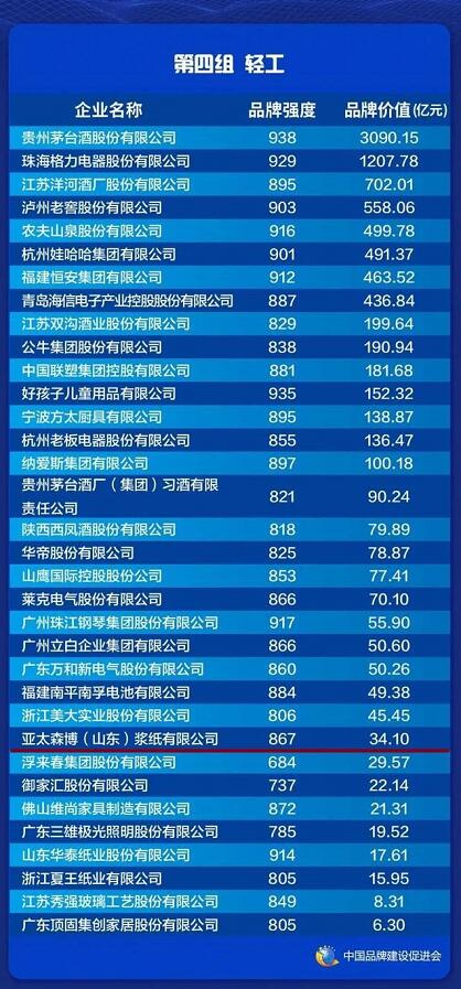 5月9日,正值我國第五個中國品牌日之際,新華社、中國品牌建設促進會、中國資產評估協會、國務院國資委新聞中心等單位在上海國際會議中心舉行“2021中國品牌價值評價信息發布暨中國品牌建設高峰論壇”。來自國家各部委有關領導、地方政府領導、各地市市場監管局領導、行業協會和企業負責人以及媒體代表等500余人參加會議。亞太森博(山東)漿紙有限公司以34.1億元的品牌價值在全國輕工領域排名第二十六位。  此次是中國品牌建設促進會聯合中國資產評估協會等相關單位,連續第八年開展的公益性品牌價值評價,評價范圍覆蓋一二三產業及部分區域品牌。本次評選依據品牌評價的國際標準和國家標準,遵循“科學、公正、公開、公認”的原則,公布了能源化工、機械設備制造、電子電氣、輕工、汽車及配件、冶金有色、紡織服裝鞋帽、建筑建材等十幾類領域的價值榜單。評價品牌數量達到1266個,包括大部分行業的龍頭企業。發布品牌數量達到695個,總品牌價值83746億元,品牌價值均值較去年增長7.9%。  公司高度重視品牌建設工作,堅持以客戶為導向,深化品牌推廣,強化品牌管理,扎實推進社會責任工作,持續塑造企業品牌形象,不斷擴大品牌影響力,提高企業的社會認同度。公司“森博”木漿品牌、“博旺”白卡紙板品牌先后被評為“山東優質品牌”,公司連續多年入選“山東省制造業高端品牌培育企業”、“山東省民營企業品牌價值100強”。公司被評為國家綠色工廠、中國造紙工業環境友好企業、中國優秀企業公民、中國社會責任典范企業、全國優秀外商投資企業、高新技術企業、山東省節能先進企業、山東省循環經濟示范企業等榮譽稱號。