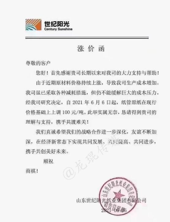 步入新的一周,國內紙業市場整體上處于漲跌互現的運行狀態。其中,北方地區存在價格上漲現象,6月6日-6月7日,山東世紀陽光紙業、山東省壽光市魯麗紙業、柏鄉縣華興紙業、柏鄉縣錦寶石新材料等紙企上漲50-100元/噸,涉及高瓦、箱板紙、紗管紙等。 北方地區部分原紙漲價函 山東世紀陽光紙業集團有限公司 從2021年6月6日起,紙管原紙在現行價格基礎上上漲100元/噸。