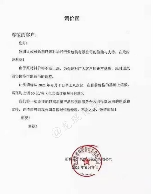 柏鄉縣華興紙業包裝有限公司 從2021年6月7日早上八點起,在目前的基礎上箱板、高瓦均上漲50元/噸(包括預付款及已接訂單)。