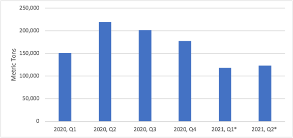 ▲2020年中國紙及紙板進出口情況 與亞洲同行相比,2020年第四季度美國在上海的運輸成本方面處于成本領先地位,成本優勢約為100-150美元/噸。然而,鑒于近期美國和中國之間的運費上漲可能高達200%,成本優勢在很大程度上受到侵蝕。當入研究對中國市場的箱板紙出口的細節時,我們可以看到,美國在2021年第二季度失去了對其他國家的第二大供應商地位,自2020年以來對中國的出口有所下降(下圖)。然而,我們可以有把握地假設,如果運費成本長期繼續保持高位,正如ING所提到的,美國生產商將箱板紙運往中國的盈利機會將會減少。