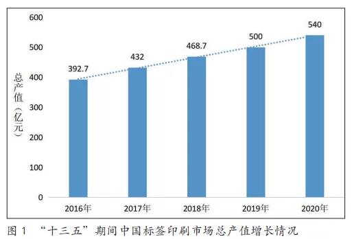 標簽印刷市場發展現狀 1. 產值概況 “十三五”期間,全球標簽印刷市場總產值以約 5%的年復合增長率穩定增長著,2020 年達到 432.5 億美元。預計“十四五”期間,全球標簽市場仍將以約 4%~ 6%的年復合增長率持續增長,預計到 2024 年總產值將達到 499 億美元。 中國作為全球最大的標簽生產國和消費國,近五年來市場增長速度迅猛,從“十三五”初標簽印刷工業總產值 392.7 億元增長至 2020 年 540 億元(如圖1所示),年復合增長率達到 8% ~ 10%,預計到 2021 年末將增至 600 億元,是全球增速最快的標簽市場之一。