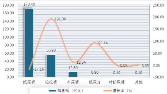 (2)線上拉拉褲成為增長最大的單品。據(jù)數(shù)據(jù)可知,2020年在我國嬰兒紙尿褲的增長率下滑17.1%的情況下,拉拉褲的增速達(dá)到了191.3%。 2020年我國嬰兒紙尿褲各子類目線上銷售額及增長率