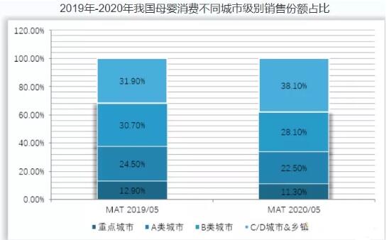 (3)母嬰消費(fèi)市場下沉,在低線城市增速顯著,有較大的發(fā)展空間。根據(jù)數(shù)據(jù)可知,2019年5月-2020年5月,我國母嬰消費(fèi)在重點(diǎn)城市、A類城市、B類城市銷售份額均下降,在低線城市的銷售份額占比從31.9%上升到38.1%。