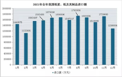 據海關總署公布數據顯示,2021年1-12月我國紙漿、紙及其制品進口量為4162萬噸,同比下降3.3%;進口額為18667008萬元,同比增長17.3%。