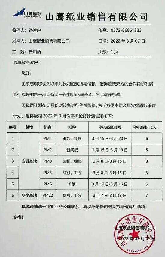 而早在3月7日,另一巨頭山鷹紙業也已發出停機通知。山鷹國際安徽基地、華中基地共計6臺紙機將于3月8日-20日期間輪流停機檢修,停機時長5-8天不等。