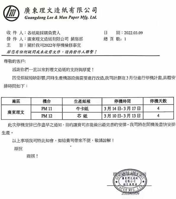 3月9日,廣東理文造紙有限公司發布停機函,稱受煤炭短缺影響及生產設備需要改造,計劃3月10日起對兩臺紙機PM11、PM12進行停機檢修,涉及牛卡紙、芯紙,停機時長4天。具體停機情況如下: