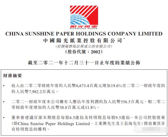 日前,陽光紙業發布年度業績公告。受紙品銷量及銷售價格增長影響,2021年實現收入79.82億元,較2020年的66.73億元增長19.6%;公司擁有人應占年度利潤約為5.565億元,較2020年的4.98億元增長11.8%。