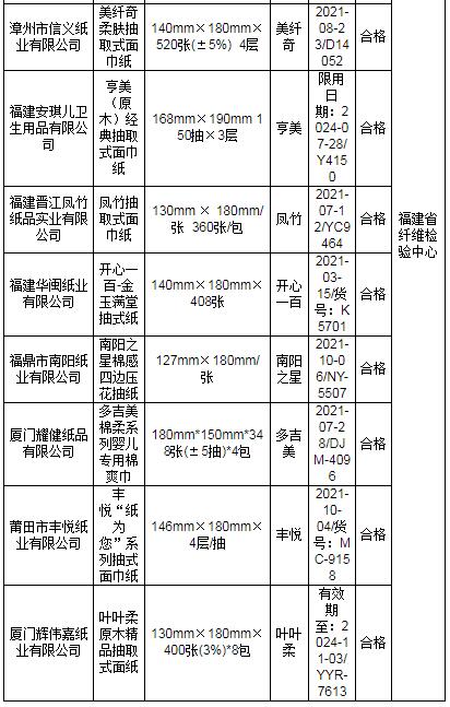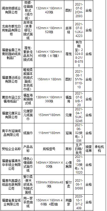近期,依據《中華人民共和國產品質量法》,福建省市場監督管理局組織對紙巾紙產品質量開展省級監督抽查。本次共抽查30家生產企業生產的30批次產品,其中1批次不合格,不合格發現率為3.3%。 本次抽查依據GB 15979-2002 《一次性使用衛生用品衛生標準》、GB/T 20808-2011 《紙巾紙》、QB/T 4509-2013 《本色生活用紙》等標準要求,對細菌菌落總數、大腸菌群、綠膿桿菌、金黃色葡萄球菌、溶血性鏈球菌、真菌菌落總數、亮度(白度)、可遷移性熒光增白劑、灰分、橫向吸液高度、橫向抗張指數、縱向濕抗張強度、柔軟度等13個項目進行檢驗。其中發現不合格項目為縱向濕抗張強度。 省市場監管局已責成市市場監管局對本次抽查不合格產品及其生產企業依法予以處理。 表1 福建省紙巾紙產品質量省級監督抽查結果(合格)