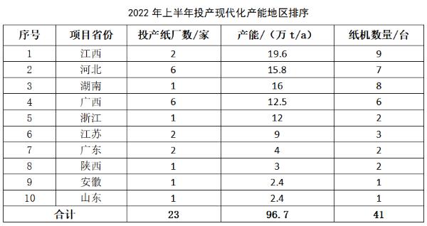 據生活用紙委員會調研,2022年1—6月,行業新投產現代化產能約96.7萬t/a,共41臺紙機,包括國產紙機37臺、進口紙機4臺。其中,第一季度投產62.4萬t,第二季度投產34.3萬t。