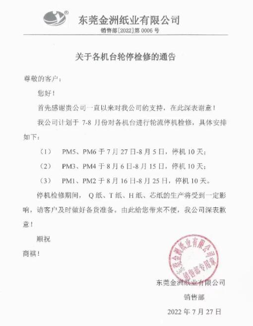 7月27日,東莞地區(qū)又一造紙巨頭加入“停機(jī)潮”。據(jù)東莞金洲紙業(yè)《關(guān)于各機(jī)臺輪停檢修的通告》顯示,該紙企計(jì)劃在7-8月份對6臺紙機(jī)進(jìn)行輪流停機(jī)檢修。停機(jī)檢修期間,Q紙、T紙、H紙、芯紙的生產(chǎn)將受到影響。 東莞金洲紙業(yè)最先開展停機(jī)的紙機(jī)是PM5和PM6,時(shí)間為7月27日-8月5日;緊接著,PM3、PM4將在8月6日-8月15日期間停機(jī)10天;PM1和PM2則在8月16日-8月25日期間停機(jī)10天。