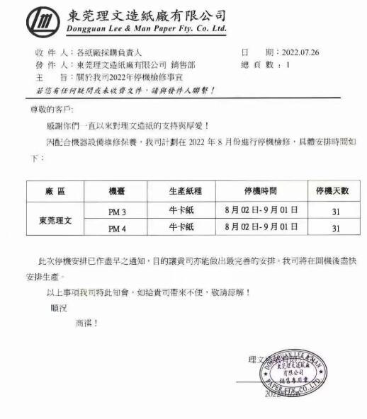 其中,廣東基地的箱板紙機(jī)PM52將從7月27日起停機(jī)7天,該臺紙機(jī)于今年5月份投產(chǎn),設(shè)計(jì)年產(chǎn)能超60萬噸;位于福建的華南基地共有4臺紙機(jī)將在8月份停機(jī),時(shí)長為15-31天;華中、浙江、安徽基地各有1臺紙機(jī)計(jì)劃停機(jī),時(shí)長為7-10天。 玖龍、山鷹均有停機(jī)計(jì)劃,同樣被稱為包裝紙行業(yè)龍頭的理文造紙自然亦是如此。同日,理文造紙旗下東莞理文宣布,因配合機(jī)器設(shè)備維修保養(yǎng),計(jì)劃在8月份對兩臺紙機(jī)停機(jī)檢修。 具體而言,東莞理文的PM3、PM4均將在8月2日-9月1日期間停機(jī)檢修,停機(jī)天數(shù)長達(dá)31天。這兩臺紙機(jī)專門生產(chǎn)?垼敉C(jī)一個(gè)月,預(yù)計(jì)將影響產(chǎn)能超5萬噸。