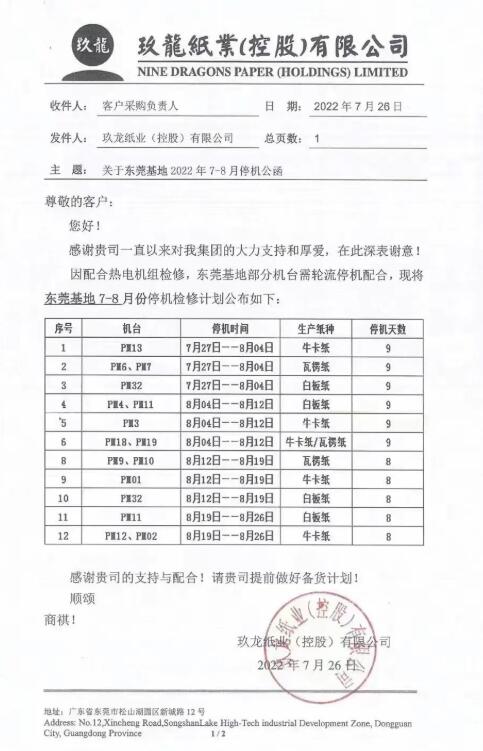 隨著東莞玖龍宣布停機(jī)檢修,山鷹國際、東莞理文、東莞金洲等大批紙廠的停機(jī)公函也已露出水面。一場規(guī)模浩大的“停機(jī)潮”,正在華南地區(qū)逐步上演。 多家造紙巨頭發(fā)布停機(jī)計(jì)劃 7月26日,東莞玖龍紙業(yè)宣布,旗下14臺紙機(jī)將在7月27日-8月26日輪流停機(jī)減產(chǎn)。該消息一經(jīng)發(fā)出,便迅速傳遍整個(gè)造紙及包裝行業(yè)。