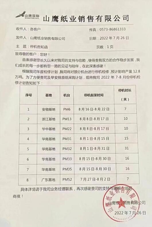 同日,山鷹國際亦發(fā)布了停機(jī)檢修通知,其安徽、浙江、華中、華南、廣東五大生產(chǎn)基地的8臺紙機(jī),將在7月27日至8月31日期間輪停產(chǎn)7-31天,預(yù)計(jì)影響產(chǎn)能12.8萬噸。