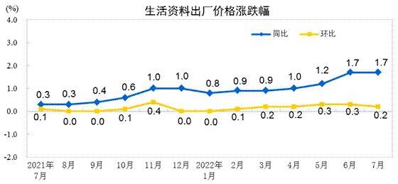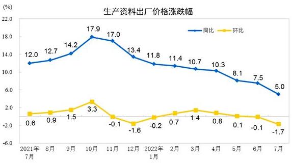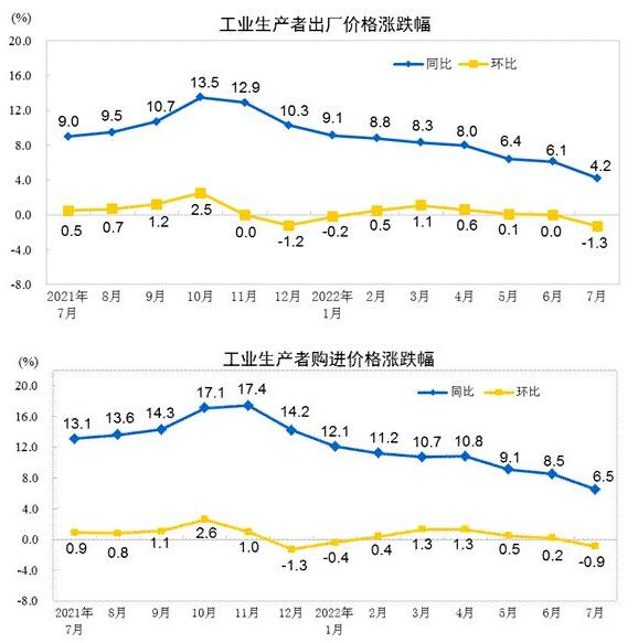 近日,國家統計局發布2022年7月份工業生產者出廠價格變動情況。2022年7月份,全國工業生產者出廠價格同比上漲4.2%,環比下降1.3%;工業生產者購進價格同比上漲6.5%,環比下降0.9%。1—7月平均,工業生產者出廠價格比去年同期上漲7.2%,工業生產者購進價格上漲9.8%。