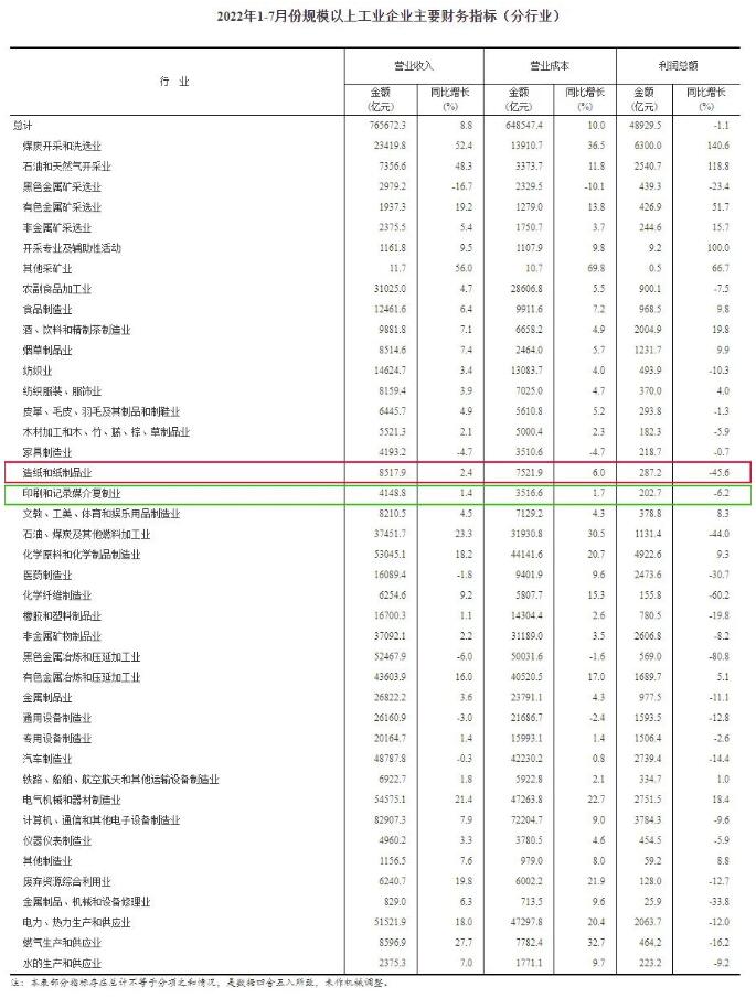 1—7月份,在41個(gè)工業(yè)大類行業(yè)中,16個(gè)行業(yè)利潤(rùn)總額同比增長(zhǎng),25個(gè)行業(yè)下降。主要行業(yè)利潤(rùn)情況如下:煤炭開采和洗選業(yè)利潤(rùn)總額同比增長(zhǎng)1.41倍,石油和天然氣開采業(yè)增長(zhǎng)1.19倍,電氣機(jī)械和器材制造業(yè)增長(zhǎng)18.4%,化學(xué)原料和化學(xué)制品制造業(yè)增長(zhǎng)9.3%,有色金屬冶煉和壓延加工業(yè)增長(zhǎng)5.1%,專用設(shè)備制造業(yè)下降2.6%,農(nóng)副食品加工業(yè)下降7.5%,非金屬礦物制品業(yè)下降8.2%,計(jì)算機(jī)、通信和其他電子設(shè)備制造業(yè)下降9.6%,紡織業(yè)下降10.3%,電力、熱力生產(chǎn)和供應(yīng)業(yè)下降12.0%,通用設(shè)備制造業(yè)下降12.8%,汽車制造業(yè)下降14.4%,石油、煤炭及其他燃料加工業(yè)下降44.0%,黑色金屬冶煉和壓延加工業(yè)下降80.8%。 值得關(guān)注的是,造紙和紙制品業(yè)實(shí)現(xiàn)利潤(rùn)總額287.2億元,同比下降45.6%;印刷和記錄媒介復(fù)制業(yè)實(shí)現(xiàn)利潤(rùn)總額202.7億元,同比下降6.2%。